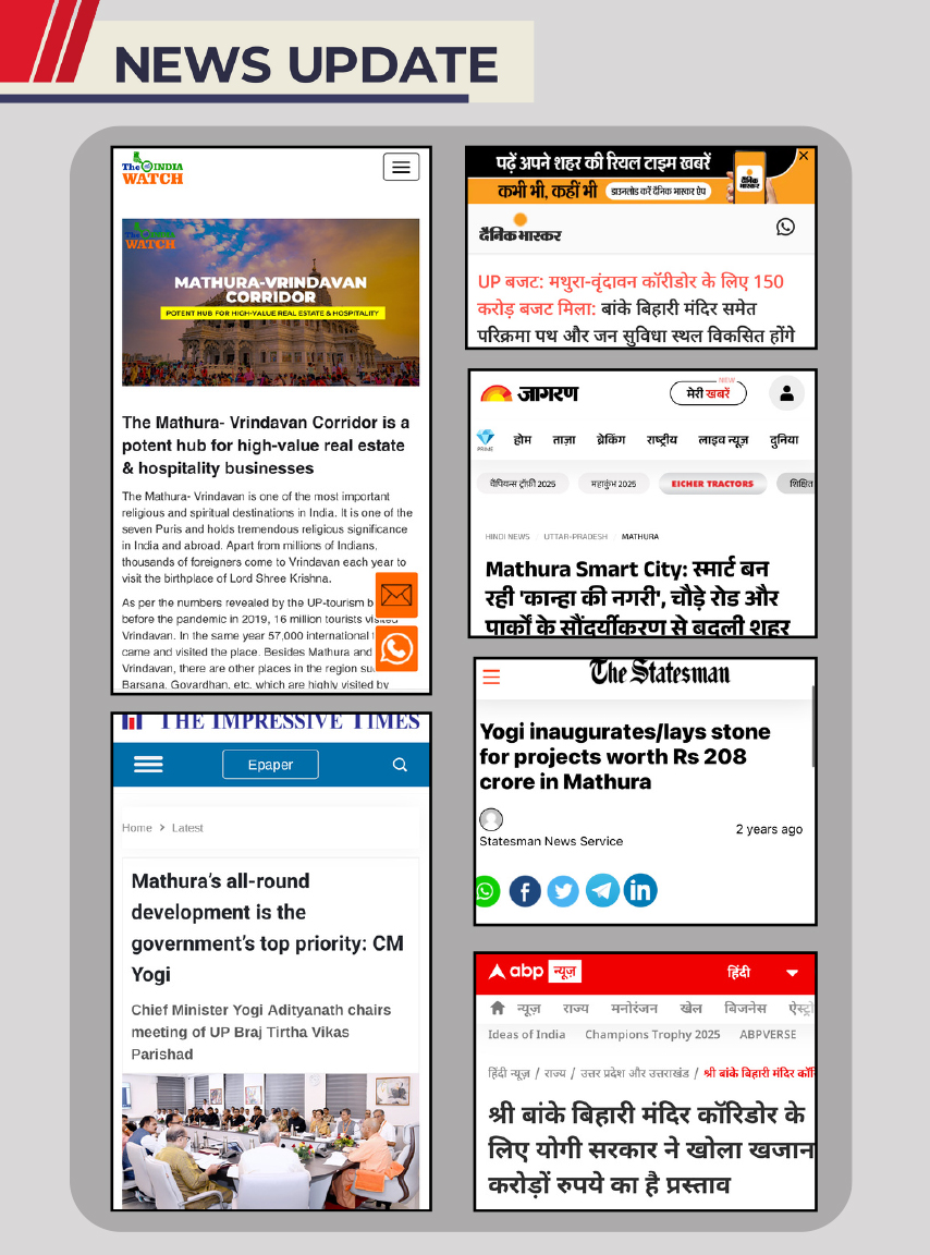 Mathura is connected to Delhi, Agra, and other major cities via NH-2 and Yamuna Expressway. The state government of Uttar Pradesh has announced several infrastructure development projects in Mathura, including a 248 crore Banke Bihari corridor, a 7 km long greenfield expressway